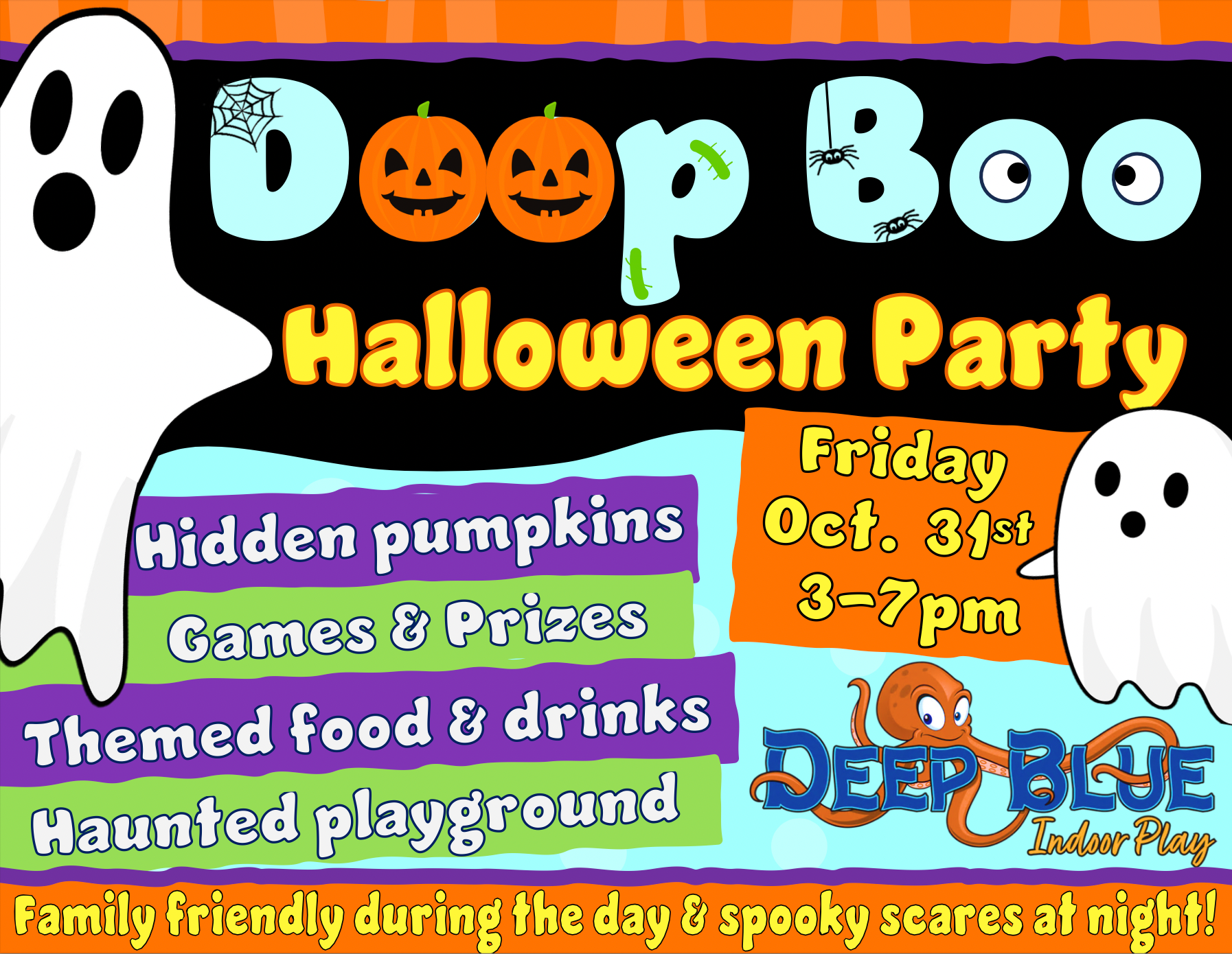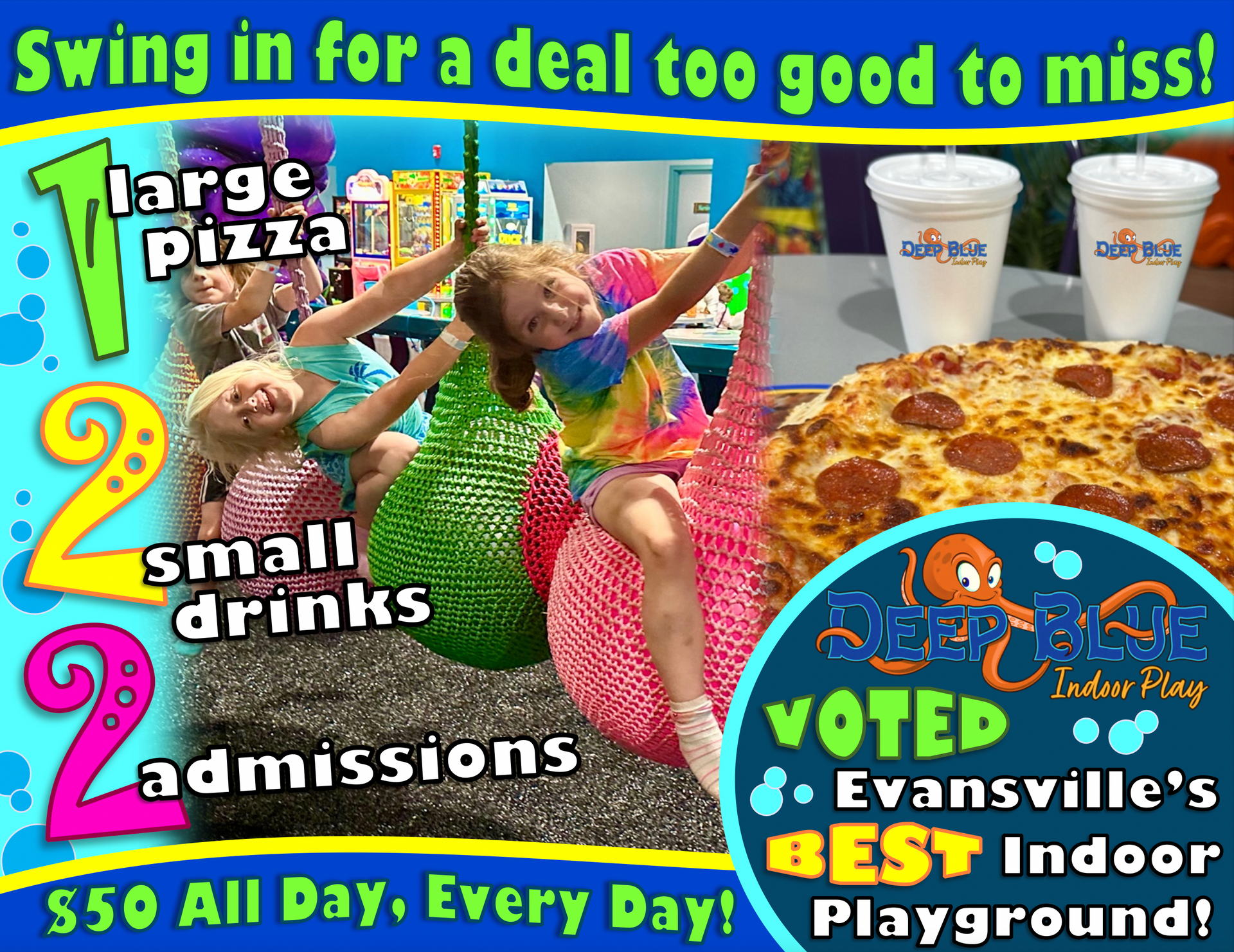 Deep Blue Indoor Play is the area’s most exciting indoor playground, filled with unique play features unseen anywhere else around! This 15,000 sq ft facility brings to life a space for imaginative fun with an under the sea feeling. As a local family owned business, it is our pleasure to bring to you a family friendly, safe atmosphere that specializes in daily walk-in play, birthday parties, and field trips for children 2-13 years of age.